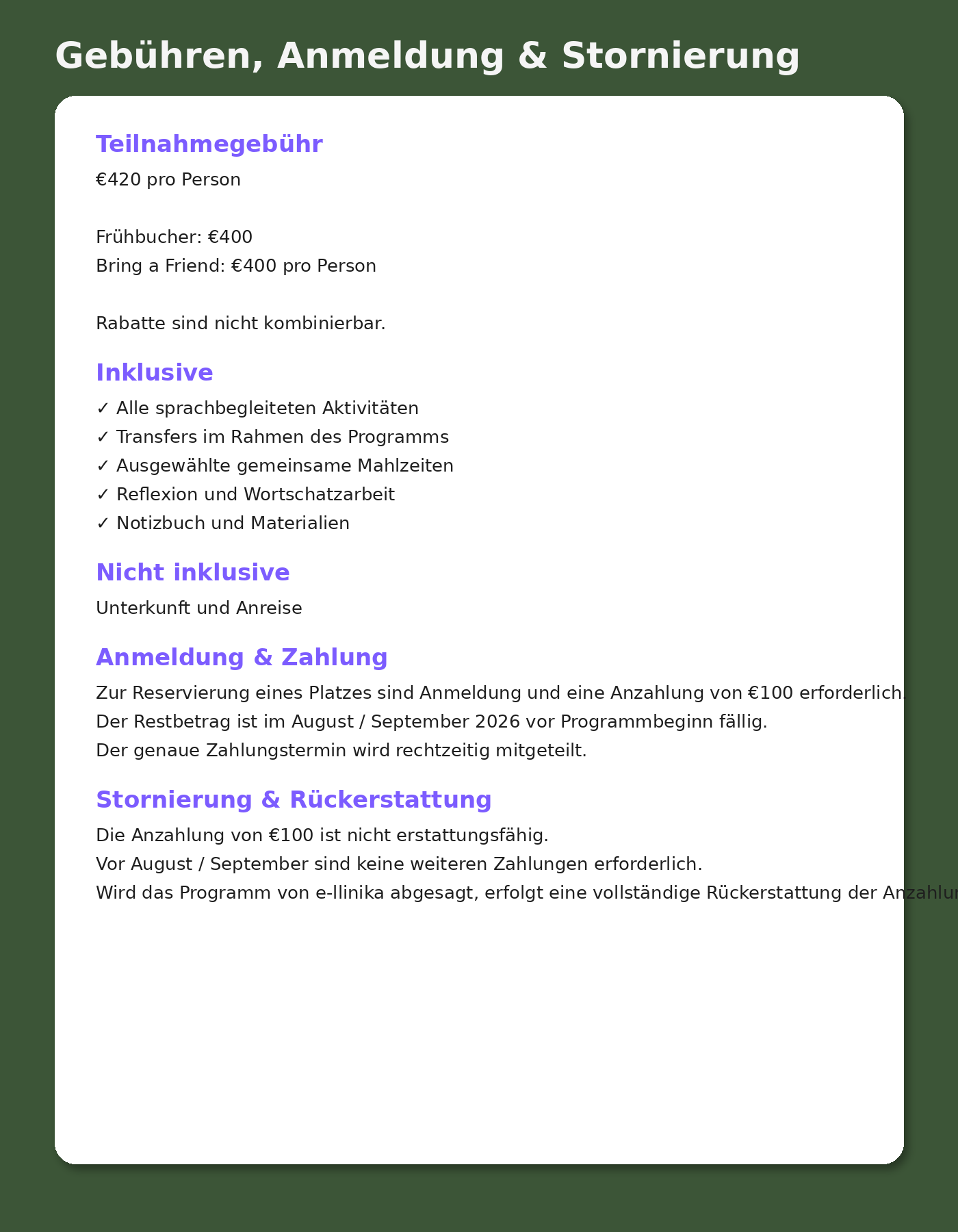 Anzahlung von €100 zur Platzreservierung